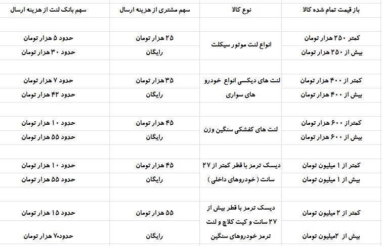 کل هزینه شهری شهر مبدا به صورت رایگان بوده و فقط هزینه باربری بصورت پس کرایه توسط مشتری پرداخت می شود . بانک لنت سعی در ارایه بهترین حالت ارسال با کمترین زمان و هزینه برای شما همکاران و مشتریان عزیز را دارد .